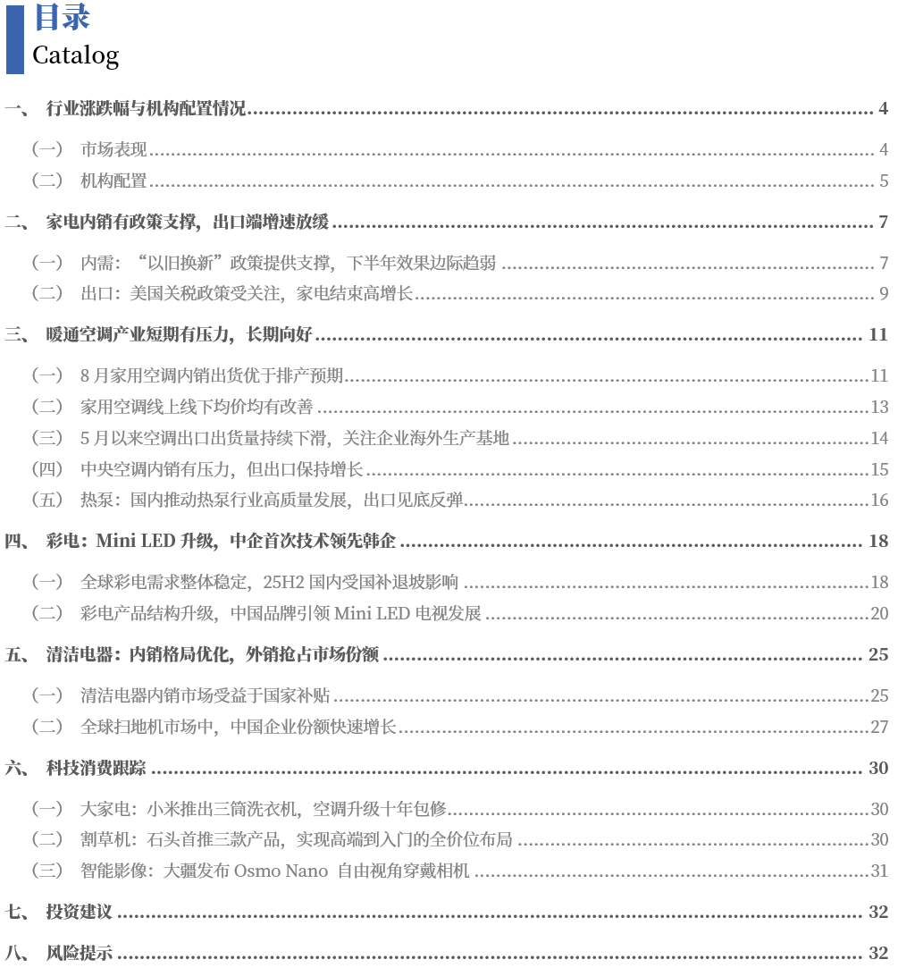 国补退坡,濒临高同比基数:1)统计局数据,8月社零同比+3.4%,增速环比-0.3pct,6月以来络续放缓;其中家用电器和音像器材类8月社零同比+14.3%。8月空调内销出货量同比+1.2%,优于之前排产预期(-11.9%),主要受多地络续性高温驱动。2)国补退坡,相配是旧年9月起国补对家电需求刺激显然,导致同时高基数压力。AVC周度数据表现,9月前两周宇宙电零卖额巨额显然下滑。3)空调行业有所预期,产业在线数据,9/10/11月空调内销排产较旧年同时内销实绩划分-6.3%/-23.4%/-17.6%,反馈了行业严慎魄力。