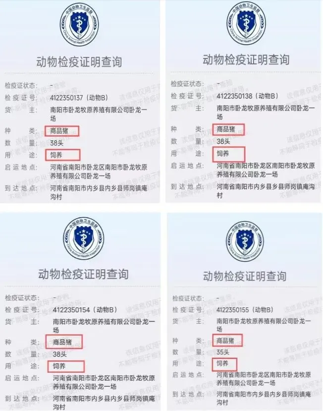 2024年4月,从卧龙牧原1场运平日先云生息场的4批怀胎母猪动物检疫证昭着示,该动物种类为“商品猪”,用途为“饲养”。